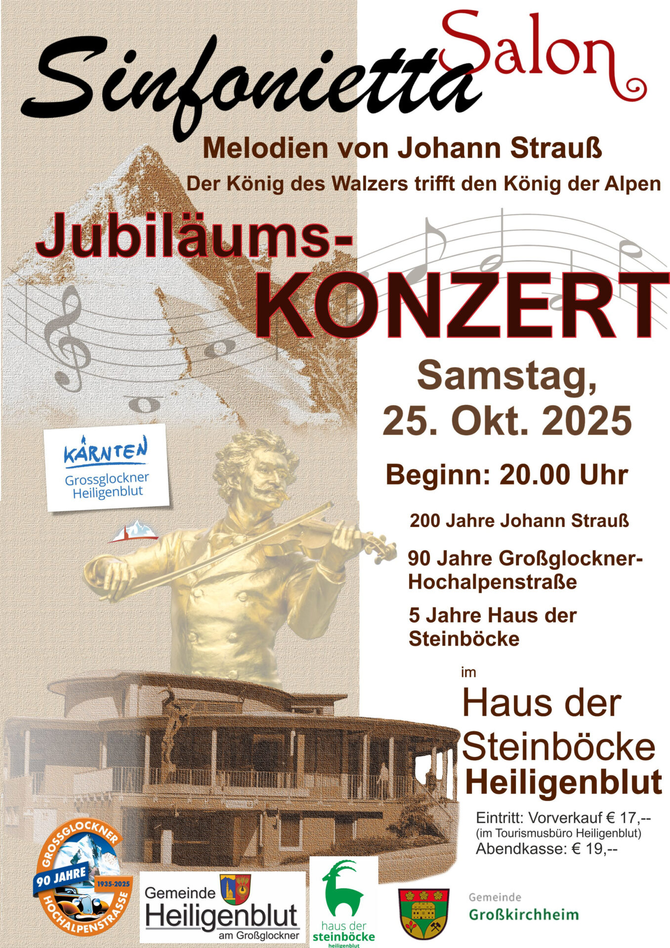 Anlässlich gleich dreier bedeutender Jubiläen – 200 Jahre Johann Strauß, 90 Jahre Großglockner Hochalpenstraße und 5 Jahre Haus der Steinböcke – laden wir zu einem festlichen Konzert im Haus der Steinböcke in Heiligenblut am Großglockner ein.